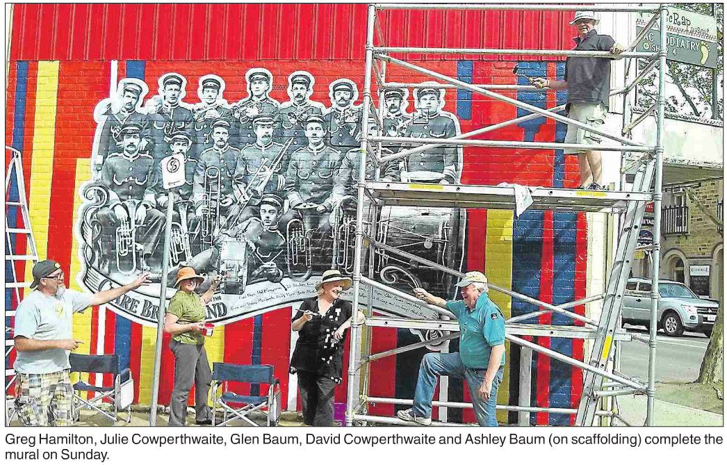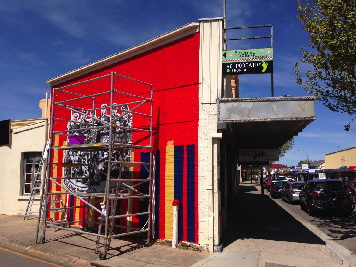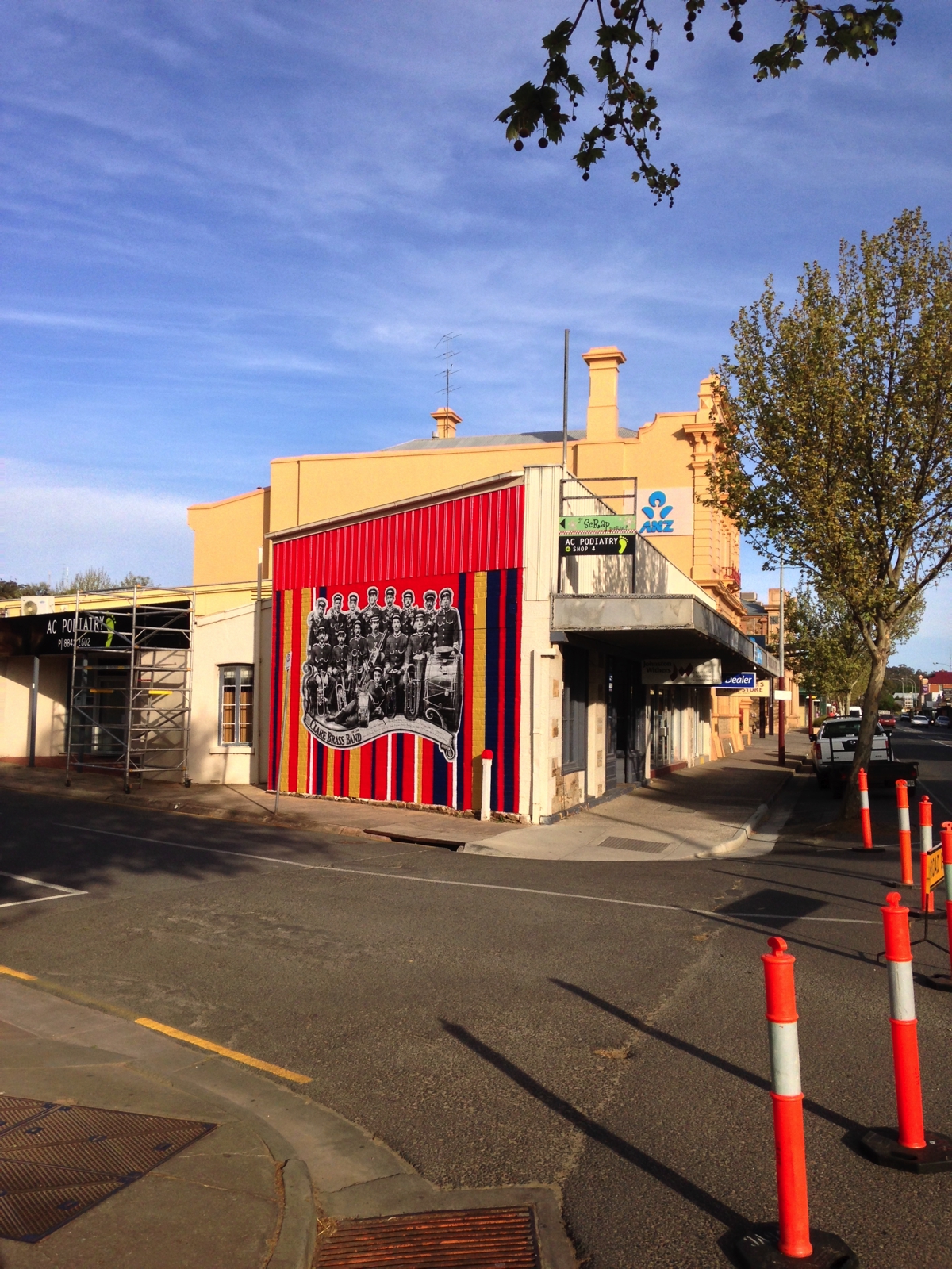 Been many years since I produced a piece of art this size, direct to a fixed wall. An original image of the Clare Brass Band selected to grace this wall in Ness Street CLARE. Image scanned at high resolution and details added, printed to a self adhesive medium suitable for outdoor use. Enjoyed this project so much, I am keen to create another installation. Big thanks to the crew who helped push this project along.